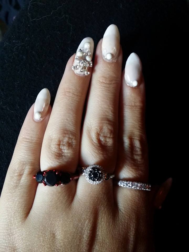 these were my wedding nails: my wedding was vintage pirate themed so pearls, jewels and a little skull on the accent finger with a cream base.