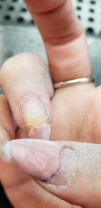 As you can see my nail was cracked right through lengthwise and all the way to the bed. It was still healing from it being bruised so badly. The acrylic had been strong enough that the bend that my nail did couldn’t bend against it and broke inwards instead. In this case I couldn’t even cut the tip of my nail down because the break wasn’t grown out yet and still resting on top of my nail bed. The most I could do was double treat it for any risk of infection and then refill to let it have the chance to grow out to the end before I can take the end off. If it was closer to the end I would of left it and let it grow and heal without the nail extension on top.